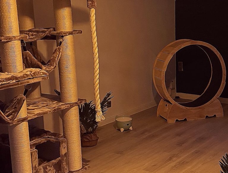 Die beiden Laufräder in unseren Gruppenzimmern bieten auch den aktivsten Samtpfoten ausreichend Bewegung.