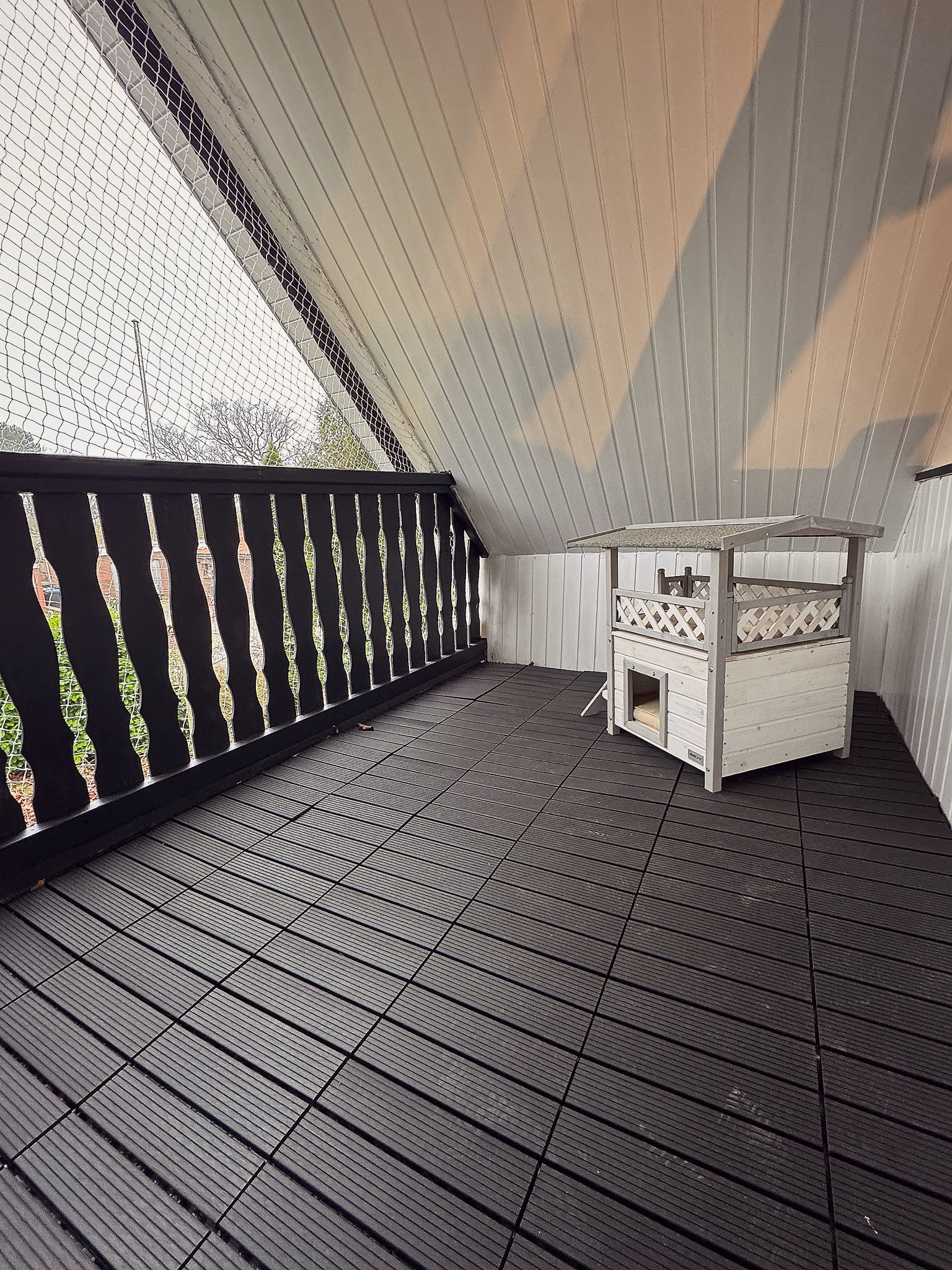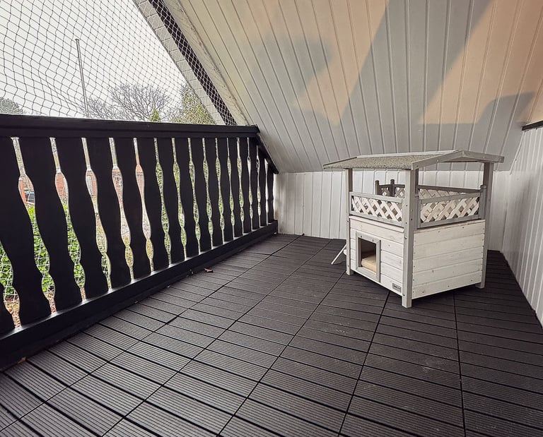 Ein katzengerecht gesicherter Balkon lädt zum Sonne tanken ein.